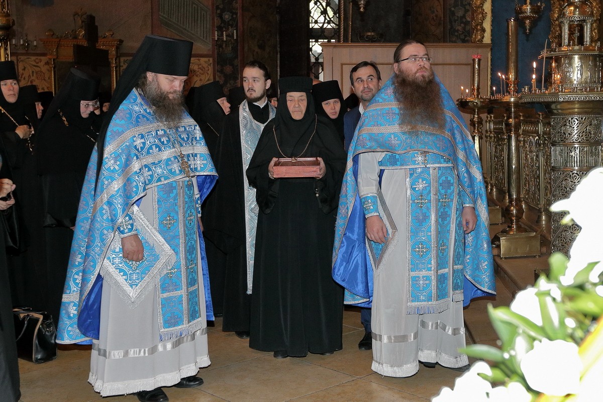 По окончании Божественной литургии в Успенском соборе Свято-Троицкой Сергиевой лавры насельники монастыря с благоговением приняли в дар святыню.