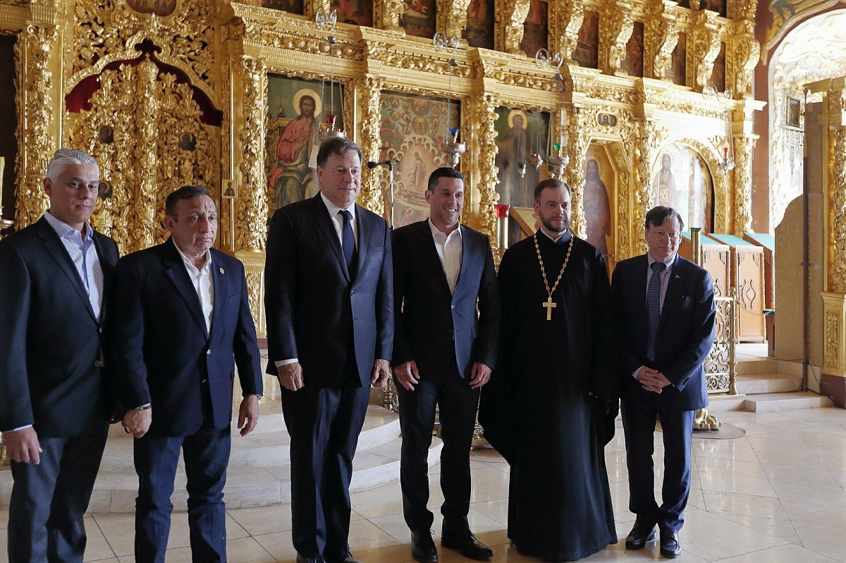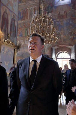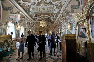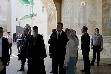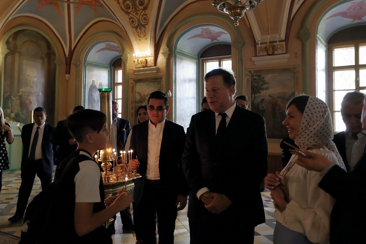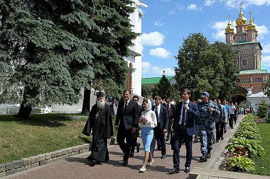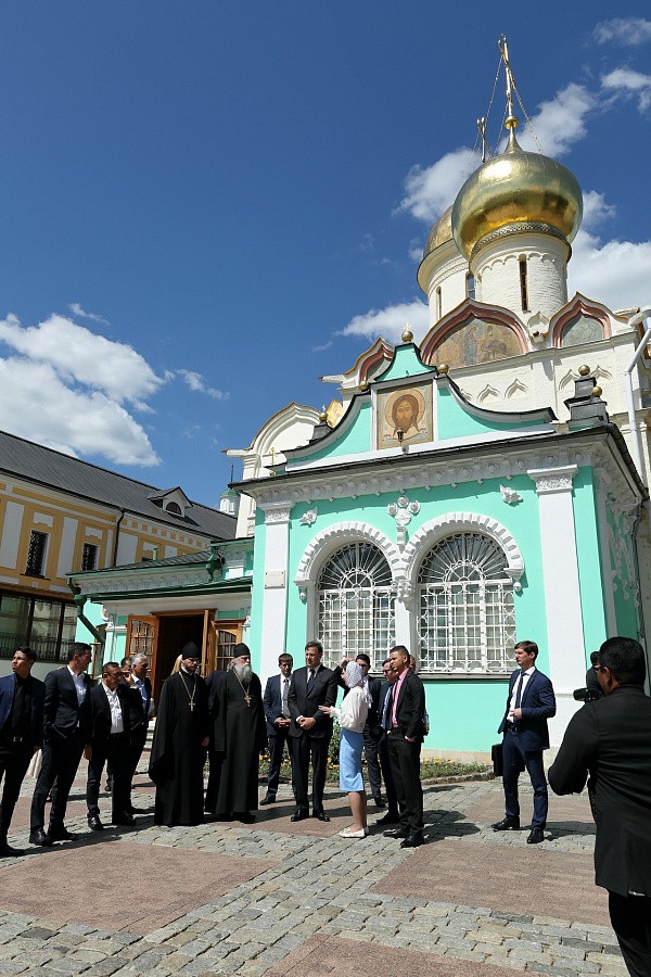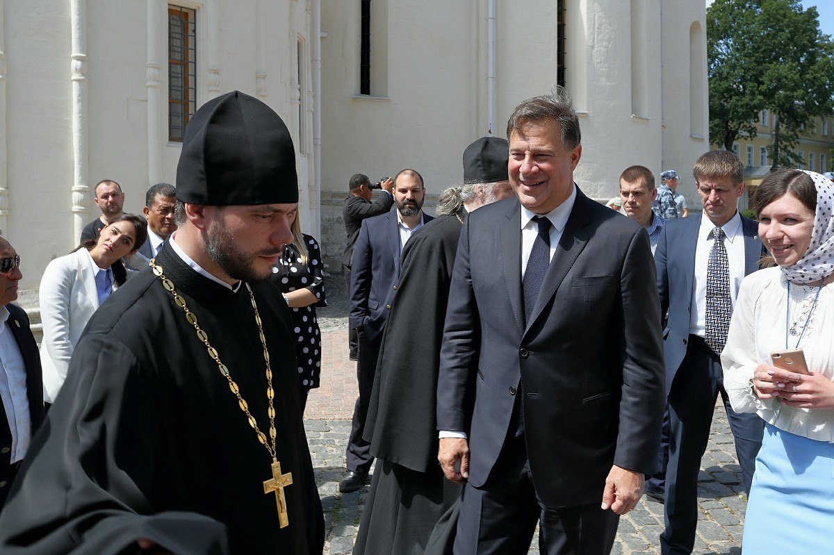 От лица Лавры высокого гостя встречали насельник обители профессор Московской духовной академии архимандрит Макарий (Веретенников) и помощник наместника монастыря по представительской работе иерей Михаил Боданов.