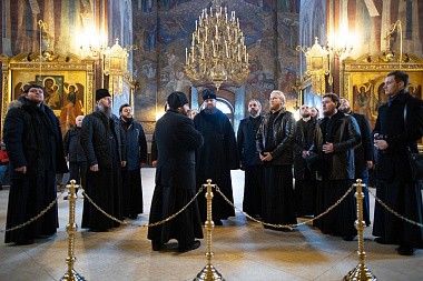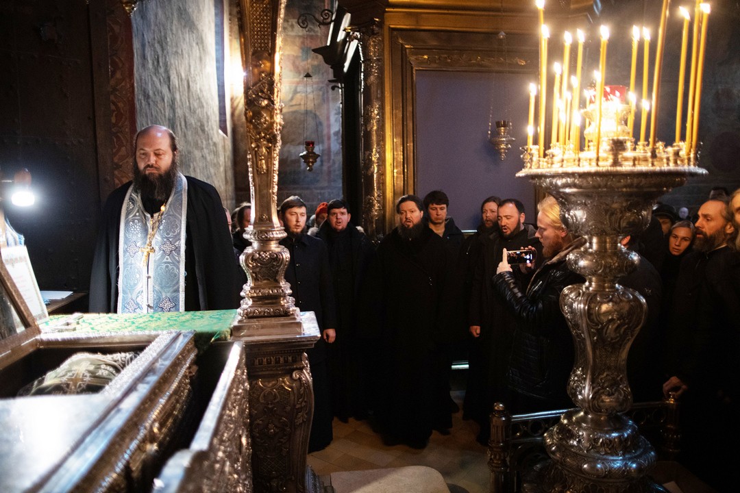 В Троицком соборе гости приложились к мощам преподобного Сергия Радонежского, исполнили величание святому и прошли в Серапионову палату с Никоновским пределом, где иеродиакон Георгий подробно рассказал о собранных в них святынях.