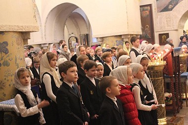 В Елизаветинской гимназии первый урок всегда начинается с молитвы. Для многих воспитанников просьба о Божией помощи перед началом всякого дела давно стала любимым сердечным навыком. Однако, особенно для детей из младших классов, богослужение кажется довольно долгим и молитвы «Отче наш» и «Символы веры» – это возможность не только вслушиваться в пение и слова священнослужителей, но и с полной самоотдачей принять участие в Литургии.
