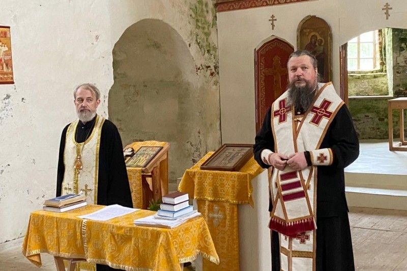 На Кий-острове приняли принесенный образ митрополит Воскресенский Дионисий, первый викарий Патриарха Московского и всея Руси, управляющий делами Московской Патриархии и епископ Плесецкий и Каргопольский Александр.