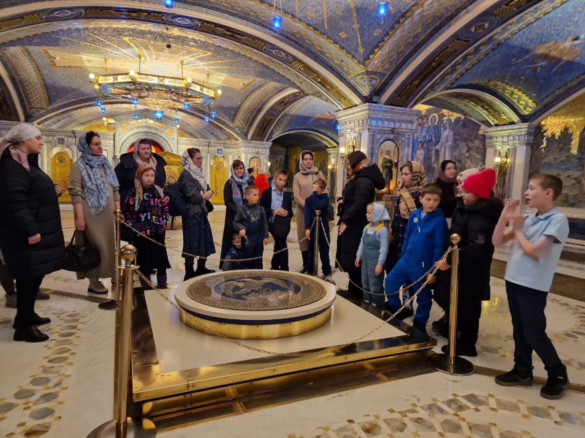 Для паломников были проведены экскурсии по храму и территории. Дети узнали о символах, использованных при создании собора, помолились образам святых, которые помогали Святой Руси одерживать победы над захватчиками, а также святым покровителям всех родов войск, в честь которых освящены приделы храма Воскресения Христова.