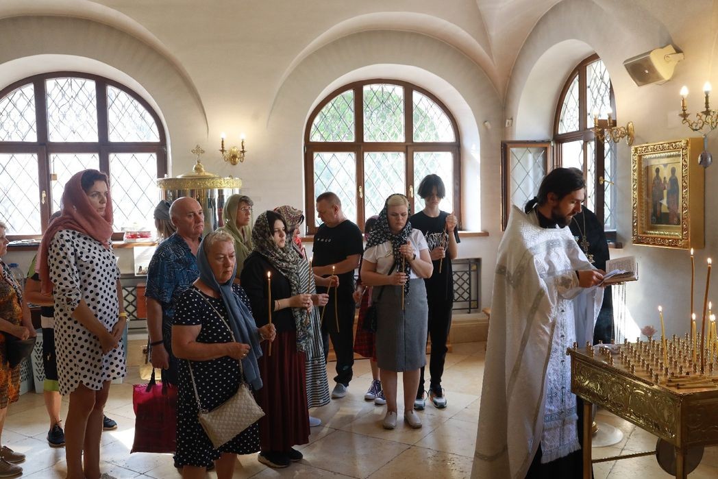 Затем паломники посетили Донской монастырь, где перед мощами святителя Тихона, Патриарха Всероссийского, был совершен молебен о мире на Украине. Поклонившись мощам святителя Тихона и иконе Божией Матери «Донская», вынужденно покинувшие Украину переселенцы ознакомились с историей обители, осмотрели Малый Донской собор, услышали рассказ о чине варения мира, традиционно здесь совершаемом Святейшим Патриархом Московским. Паломники посетили также монастырский некрополь и увидели уцелевшие горельефы из разрушенного в 1931 году Храма Христа Спасителя.