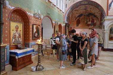 Далее гостей радушно принял Данилов монастырь: богомольцам была предоставлена возможность поклониться мощам святых благоверных князей Александра Невского и Даниила Московского и другим святыням, хранимым в обители; посетить келью преподобноисповедника Георгия Даниловского, осмотреть Троицкий собор и храм Святых Отцов Семи Вселенских Соборов. Обзорное знакомство с находящимися на территории монастыря строениями (Патриаршая резиденция и Отдел внешних церковных связей, дом наместника и надвратная колокольня) завершилось обедом в трапезной.