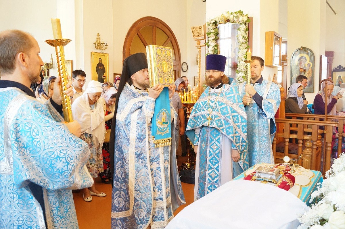 Накануне, 27 августа, во время Всенощного бдения Плащаница Божией Матери была торжественно вынесена на середину храма и возложена на украшенной цветами гробнице. Во все время пребывания Плащаницы в храме пред нею возжигаются свечи, горит неугасимая лампада, воскуряется благовонный ладан. В честь праздника перед Плащаницей торжественно был прочитан акафист Успения Матери Божией.