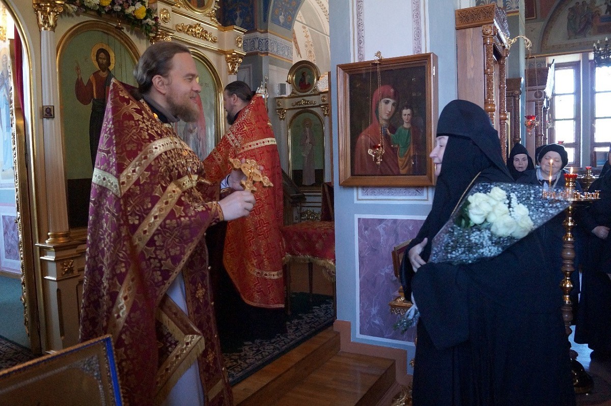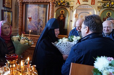 По окончании богослужения игумению Марию от лица духовенства поздравил старший священник монастыря иеромонах Адриан (Чаликов) и преподнес Ее Высокопреподобию в знак непрестанного поминовения настоятельницы обители пред Престолом Божиим богослужебную праздничную просфору и букет цветов, самостоятельно составленный духовенством обители.