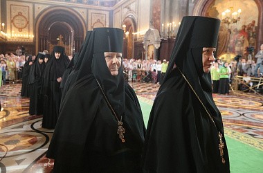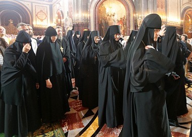 Молитвенное участие в праздничном богослужении приняли игумены и игумении монастырей Русской Православной Церкви во главе с Председателем Синодального отдела по монастырям и монашеству архиепископом Сергиево-Посадским Феогностом и Его Заместителем, настоятельницей Зачатьевского ставропигиального женского монастыря игуменией Иулианией (Каледой).