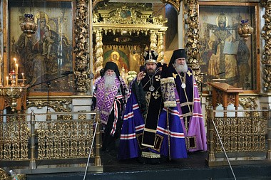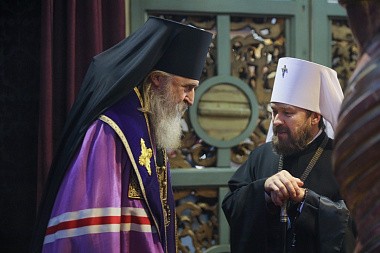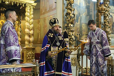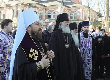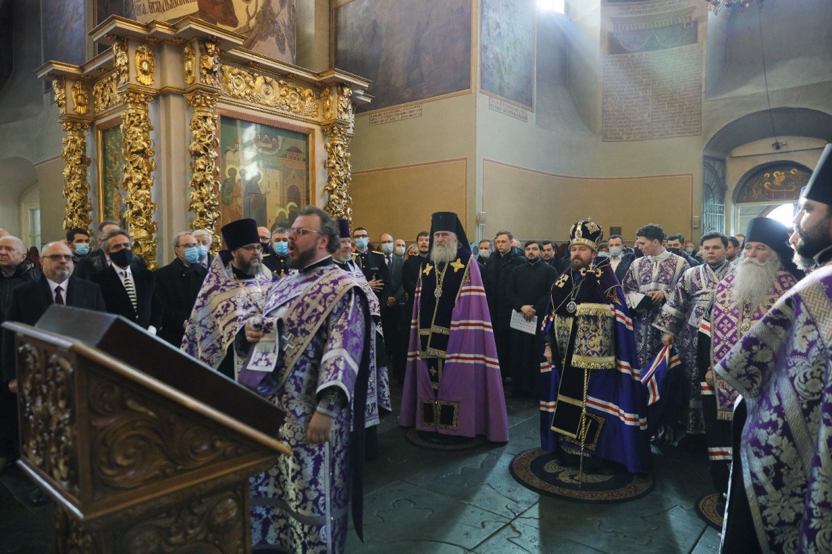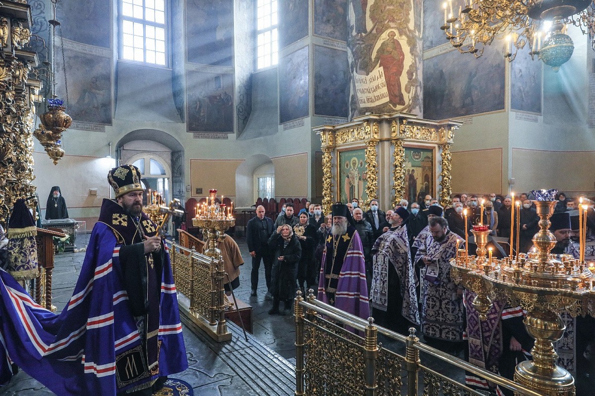 По благословению Святейшего Патриарха Московского и всея Руси Кирилла богослужение возглавил председатель Отдела внешних церковных связей Московского Патриархата митрополит Волоколамский Иларион в сослужении председателя Синодального отдела по монастырям и монашеству, наместника Донского ставропигиального мужского монастыря архиепископа Каширского Феогноста и викария Святейшего Патриарха, наместника Андреевского ставропигиального мужского монастыря епископа Дмитровского Феофилакта.