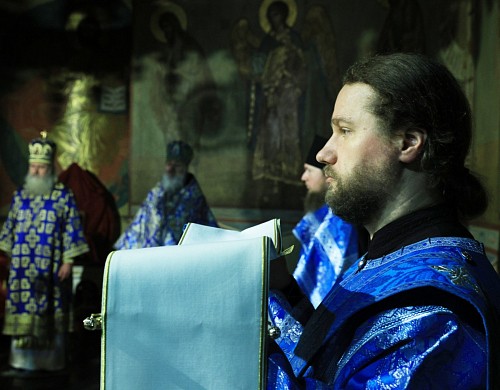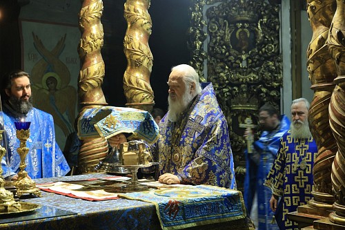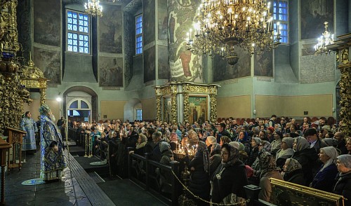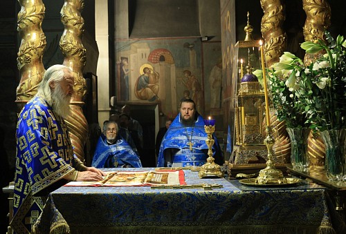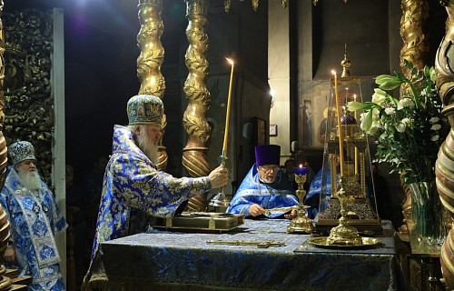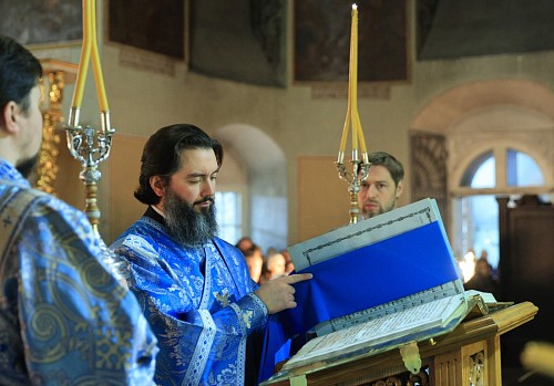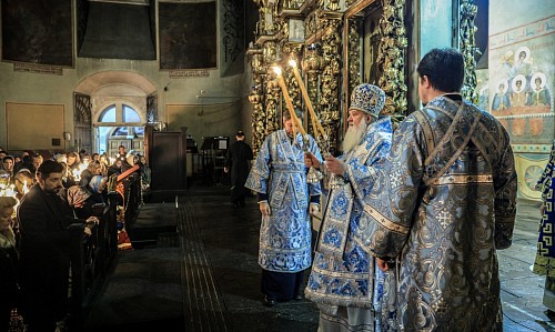 Его Высокопреосвященству сослужили наместник Екатерининского ставропигиального мужского монастыря епископ Видновский Тихон, наместник Высоцкого ставропигиального мужского монастыря епископ Серпуховской Роман, братия обители в священном сане.