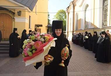 По окончании Литургии игумения Феофания (Мискина) от лица сестер Покровского монастыря и паломников приветствовала Святейшего Владыку и преподнесла Его Святейшеству икону святой Матроны Московской и букет цветов.