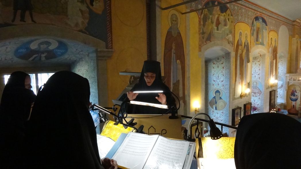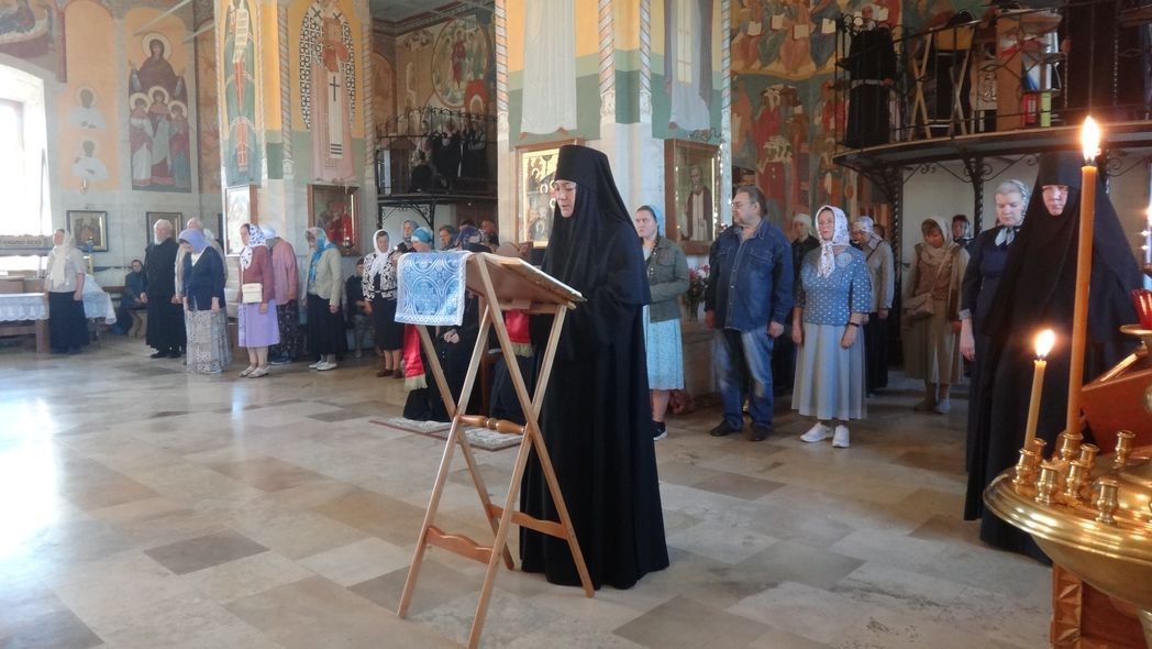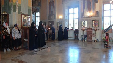 За Литургией молились настоятельница обители игумения Неонилла (Фролова) с сестрами и воспитанницами «Службы помощи семье и детям», настоятельница Свято-Троицкого Александро-Невского ставропигиального женского монастыря в селе Акатово Московской области игумения Антония (Минина).
