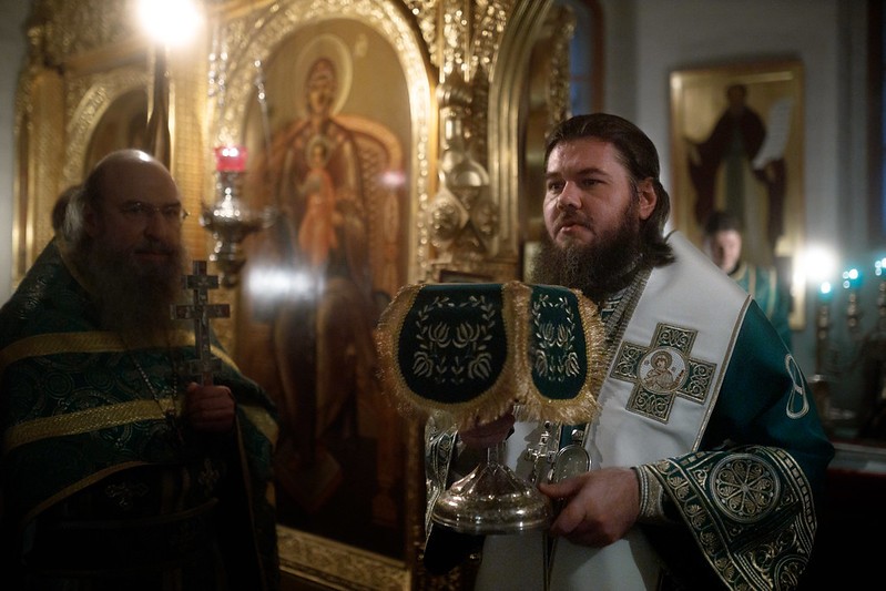 Преосвященным владыкам сослужили настоятель Оптинского подворья в Москве архимандрит Мелхиседек (Артюхин), пресс-секретарь Синодального отдела по монастырям и монашеству, братия обители в священном сане.