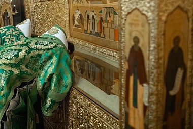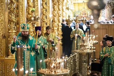 Накануне праздника наместник монастыря епископ Сергиево-Посадский Парамон возглавил всенощное бдение в Успенском соборе Лавры.