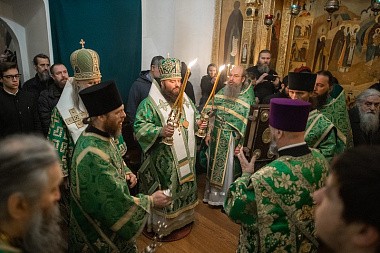 Преосвященнейшим владыкам сослужили пресс-секретарь Синодального отдела по монастырям и монашеству, наместник Московского подворья Введенского ставропигиального мужского монастыря Оптина пустынь архимандрит Мелхиседек (Артюхин), наместник Саввино-Сторожевского ставропигиального мужского монастыря архимандрит Павел (Кривоногов), братия Лавры в священном сане.