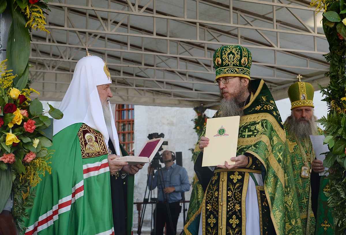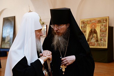 Святейший Патриарх Кирилл поблагодарил архимандрита Савву (Фатеева) за труды и вручил юбилейный крест, изготовленный по случаю празднования 1000-летия преставления Крестителя Руси. Насельникам обители Святейший Владыка передал богослужебные Евангелия.