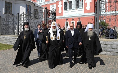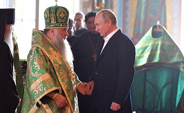 Президент России В.В. Путин и Святейший Патриарх Кирилл в сопровождении архиереев и духовенства спустились в нижний храм Спасо-Преображенского собора, где было совершено славление у честных мощей преподобных Сергия и Германа. Глава государства и Предстоятель Русской Церкви после молитвы основателям обители поклонились их святым мощам.