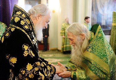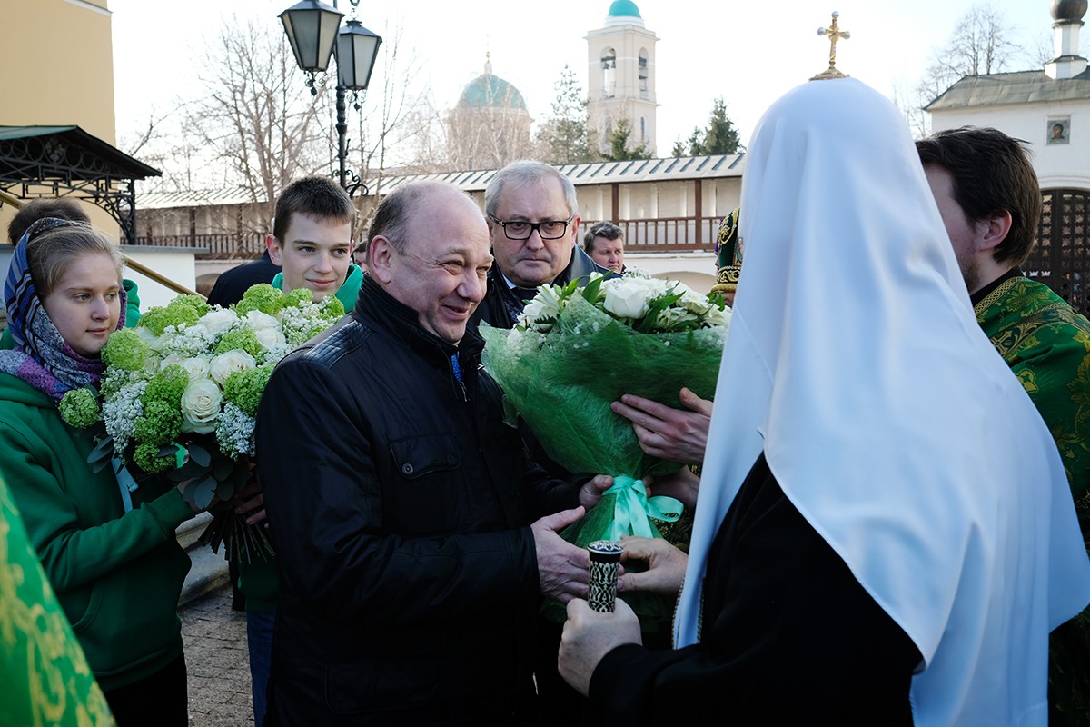 От лица насельников Данилова монастыря наместник обители архимандрит Алексий (Поликарпов) приветствовал Святейшего Владыку и преподнес Его Святейшеству портрет митрополита Платона (Левшина), который составил и опубликовал в 1791 году житие святого благоверного князя Даниила и службу ему.
