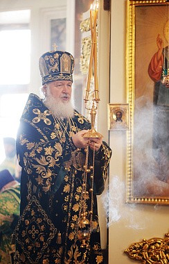 По окончании Литургии Святейший Патриарх Кирилл совершил славление у ковчега с частицей честных мощей святого благоверного князя Даниила.