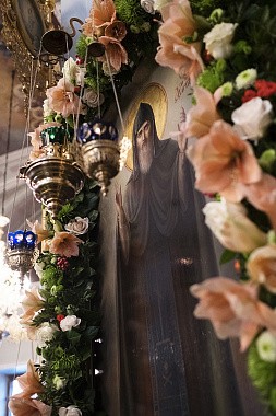 В память о богослужении в дар обители Святейший Патриарх Кирилл передал картину XIX века, изображающую Христа в терновом венце.