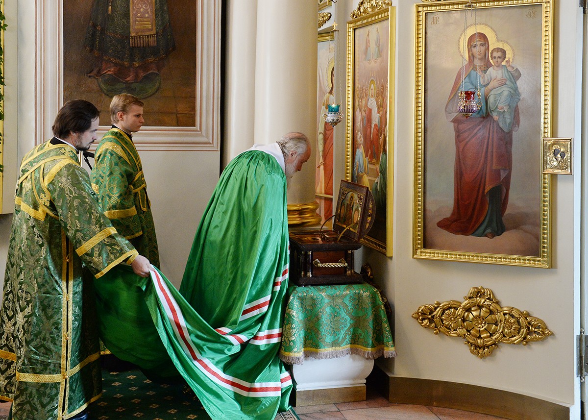 По окончании Литургии Святейший Владыка совершил славление и прочитал молитву перед ковчегами с частицами мощей святых благоверных князей Даниила Московского и Александра Невского.
