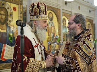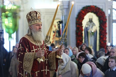 В завершение владыка Феогност поздравил братию и прихожан с днем памяти небесного покровителя обители и передал поздравление Святейшего Патриарха Московского и всея Руси Кирилла наместнику Сретенского монастыря игумену Иоанну (Лудищеву) с 20-летием иерейской хиротонии.