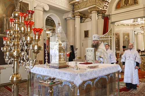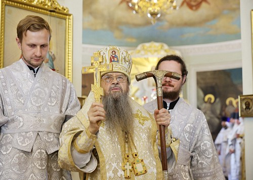 По окончании Литургии архимандрит Стефан (Тараканов) передал епископу Алексию поздравление Святейшего Патриарха Московского и всея Руси Кирилла по случаю дня тезоименитства: