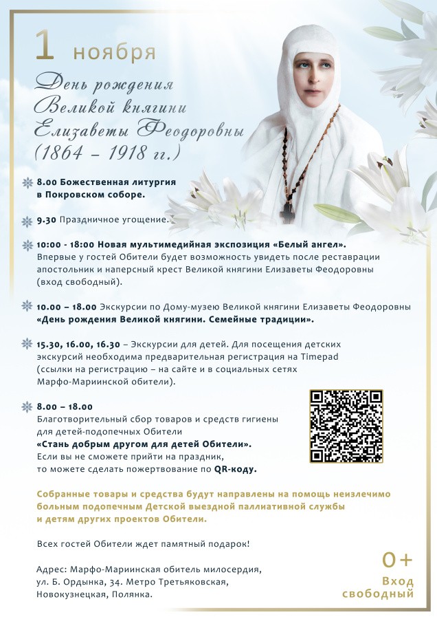 1 ноября – день рождения Великой княгини Елизаветы Феодоровны (1864-1918 гг.), основательницы Марфо-Мариинской обители милосердия. В этот день Марфо-Мариинская обитель приглашает почтить ее память и принять участие в культурно-просветительских и благотворительных мероприятиях.