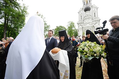 У ступеней храма Предстоятеля Русской Православной Церкви встречали: настоятельница Покровского ставропигиального женского монастыря игумения Феофания (Мискина); руководитель Департамента национальной политики и межрелигиозных связей г. Москвы В.И. Сучков; префект Северо-Западного административного округа А.А. Пашков; глава управы района Строгино В.В. Коновалов. Святейшего Владыку также приветствовали учащиеся православной гимназии в Троице-Лыкове.