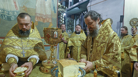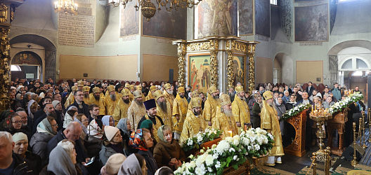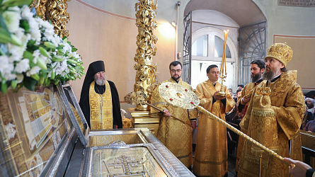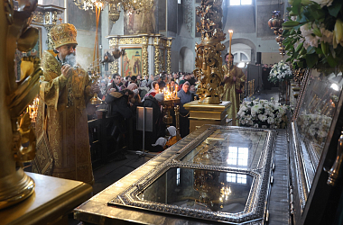 По окончании Божественной литургии было совершено славление с молитвой перед мощами святителя Тихона, Патриарха Московского и всея России.