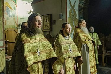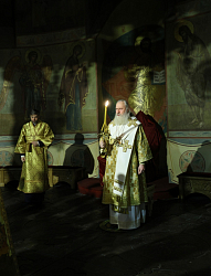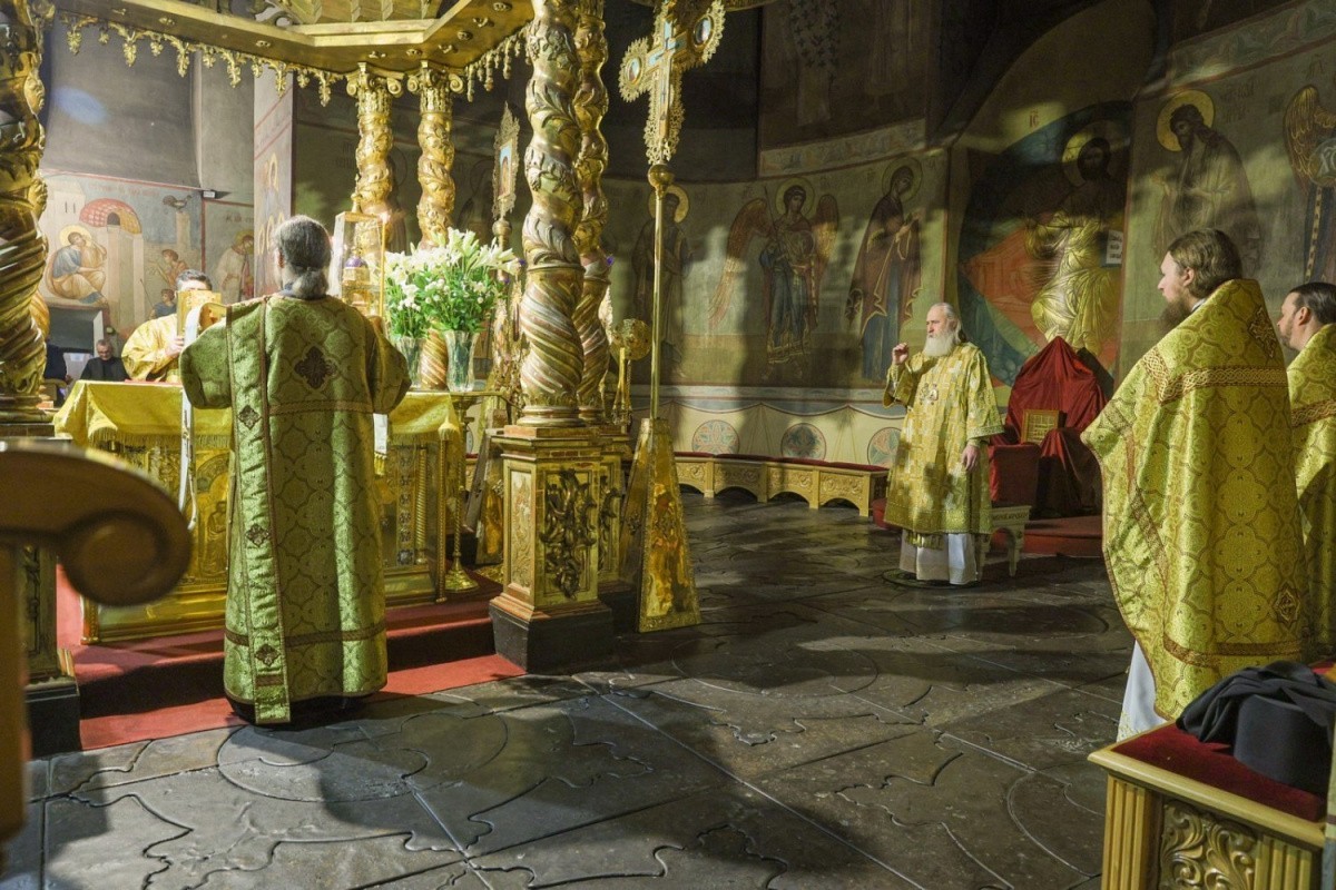 Его Высокопреосвященству сослужила братия обители в священном сане.