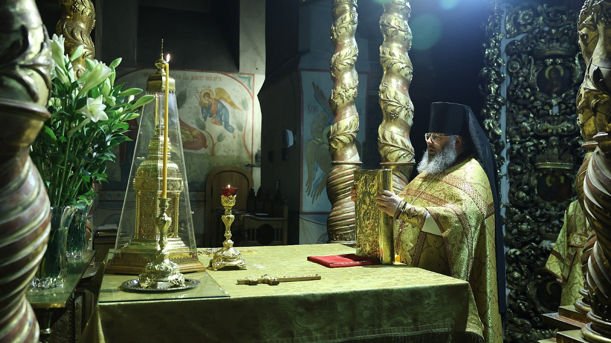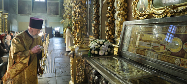 По окончании Литургии было совершено славление и молитва у мощей святителя Тихона в Большом соборе обители.