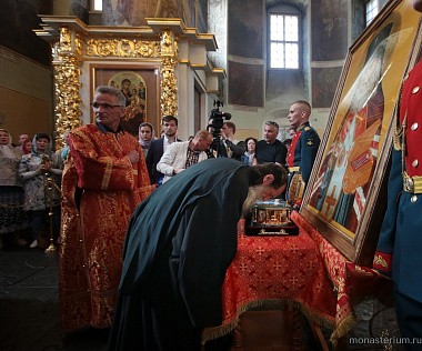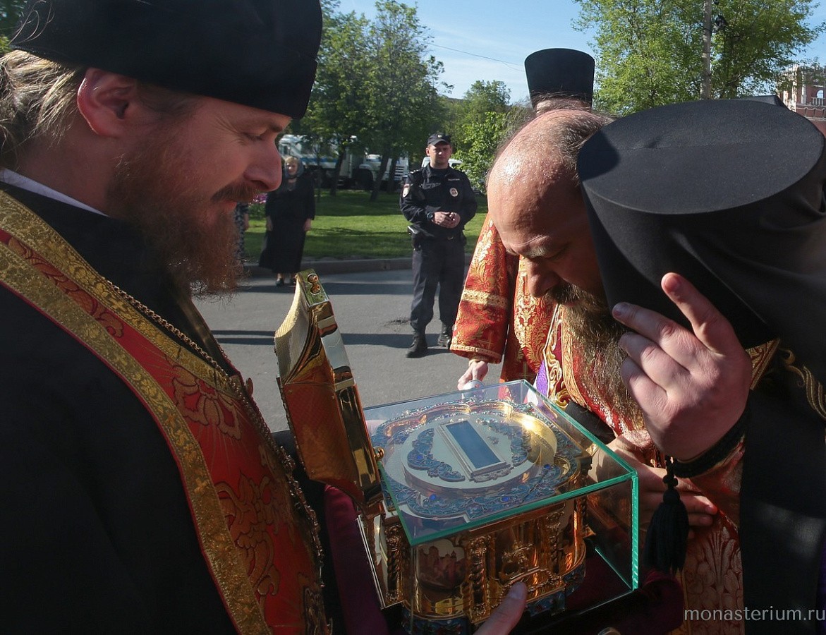 В этот день в Донском ставропигиальном мужском монастыре в 17.00 состоялась торжественная встреча святыни. У Святых врат обители ковчег с частицей мощей святителя Луки Крымского и чтимую икону святого встретили наместник монастыря епископ Бронницкий Парамон с братией.