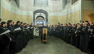 Богослужебные песнопения исполнил сводный хор выпускников духовных школ Свято-Троицкой Сергиевой лавры.