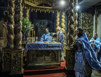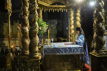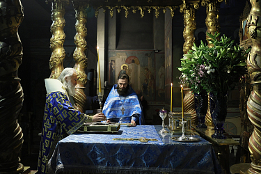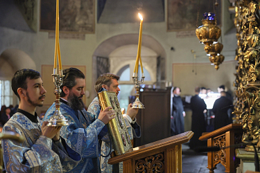 Его Высокопреосвященству сослужила братия обители в священном сане.