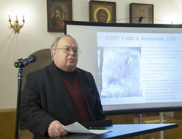 Утреннее заседание открылось докладом «Монастырь или келия? К вопросу о статусе пещерных обителей в Горном Крыму» А.Ю. Виноградова, кандидата исторических наук, доцента, старшего научного сотрудника Национального исследовательского университета «Высшая школа экономики». Задачей данного сообщения, по словам самого автора, было привлечение внимания к проблеме исследования комплексов древних пещерных сооружений, которых в Крыму насчитывается около тридцати. Одним из главных вопросов является определение их статуса: все ли они имеют монастырскую принадлежность, какой тип устроения монашеской жизни представляют и т.п. Ответы на эти вопросы порой приходится находить в экстремальной ситуации с применением альпинистских навыков: именно так был найден пещерный храм, расположенный в монашеской келии на Загайтанской скале (Инкерман), а под его фресками почти случайно открыта уникальная строительная надпись, позволившая узнать дату постройки (1303 г.), посвящение храма Николаю Чудотворцу и иные важные исторические сведения.