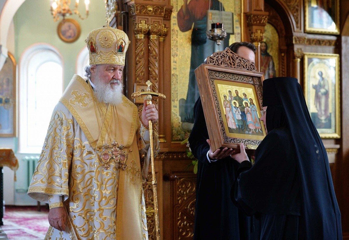 В память о совершенном богослужении Святейший Патриарх передал игумении Людмиле икону Царственных страстотерпцев.