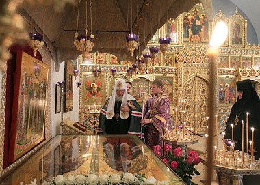 По окончании богослужения игумения Иулиания приветствовала Святейшего Владыку и преподнесла в дар Его Святейшеству Постную Триодь.