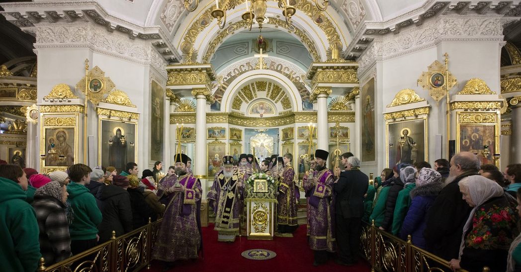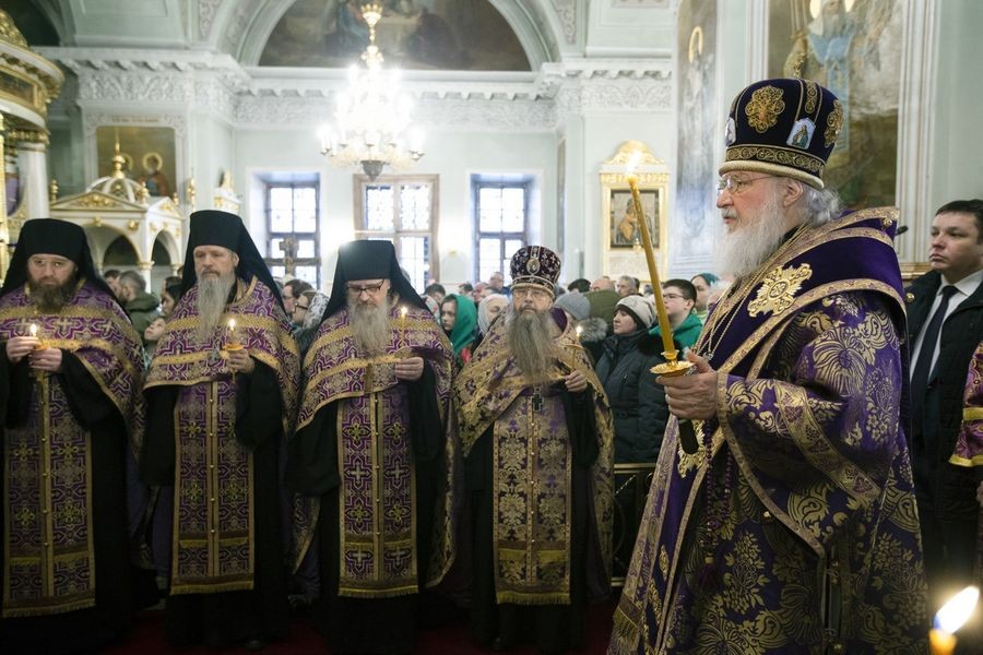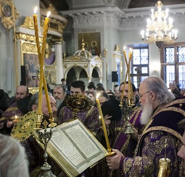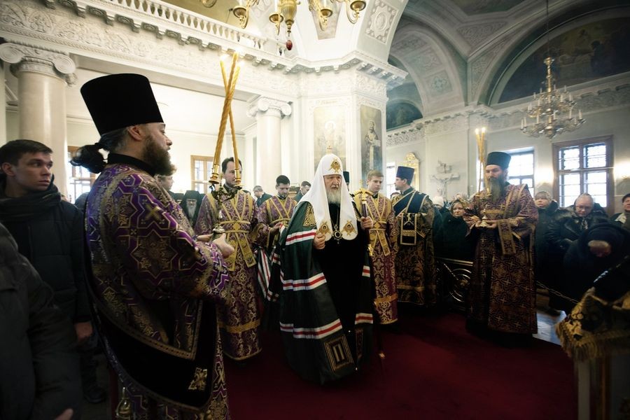 Вечером 15 марта 2019 года, в канун субботы первой седмицы Великого поста, дня памяти вмч. Феодора Тирона, праздника иконы Божией Матери, именуемой «Державная», Святейший Патриарх Московский и всея Руси Кирилл совершил полиелейную утреню в Троицком соборе Данилова ставропигиального мужского монастыря Москвы.