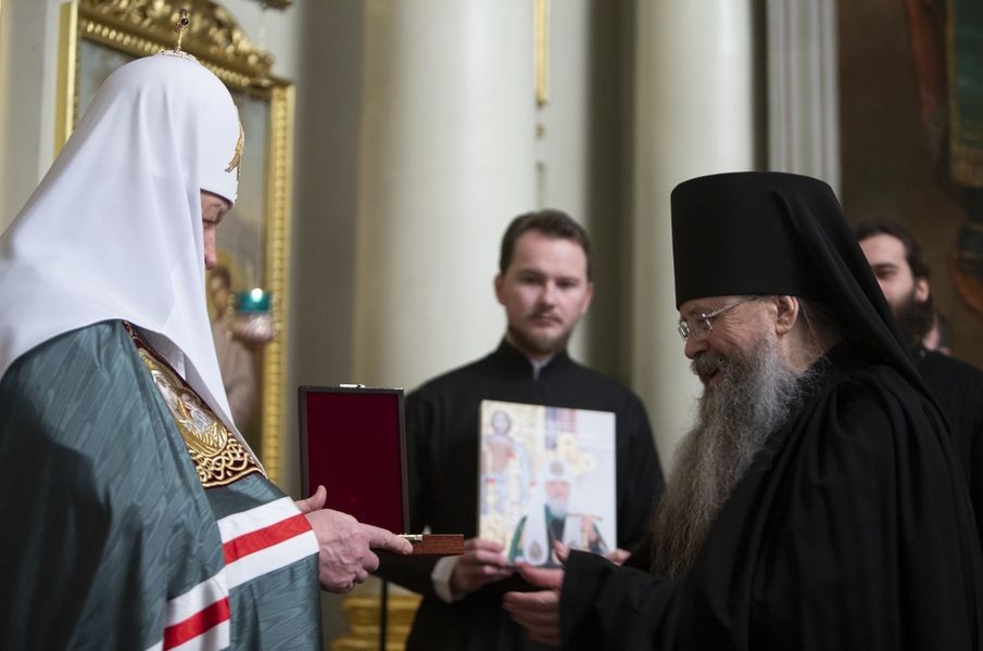 Затем Святейший Патриарх вручил архимандриту Алексию юбилейный наперсный крест, изготовленный к 10-й годовщине Поместного Собора 2009 года и интронизации Его Святейшества. «Хотел бы сердечно поблагодарить Вас, отец Алексий, за Ваши труды. Пусть Господь хранит Вас в трудах на благо сей святой обители», – сказал Предстоятель при вручении креста.