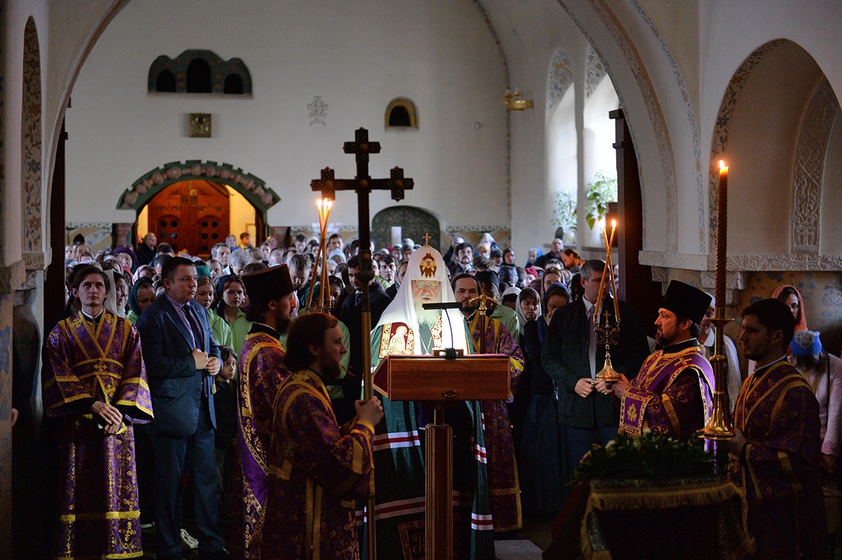 Предстоятель Русской Православной Церкви принял участие в вечернем богослужении в храме Покрова Пресвятой Богородицы.