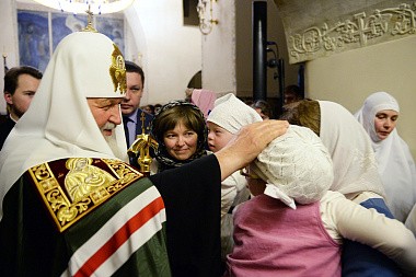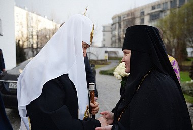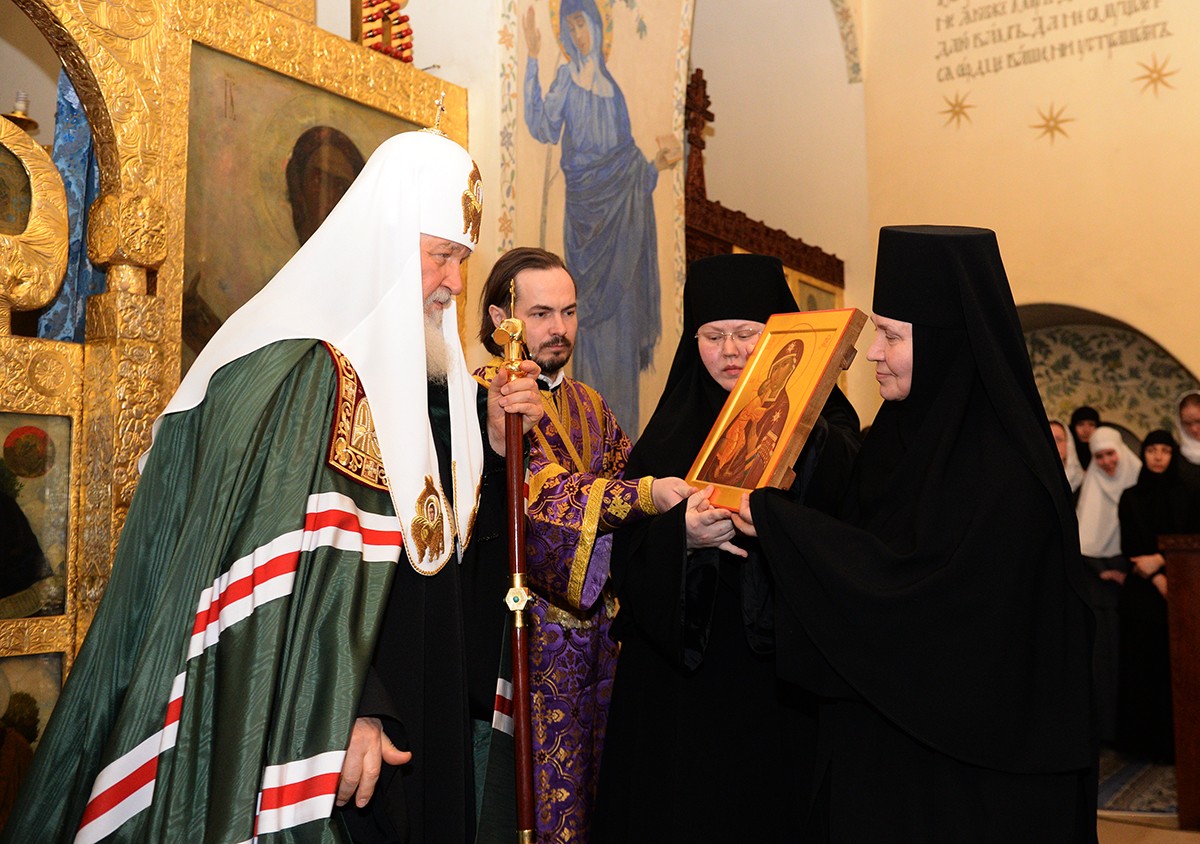 По окончании богослужения настоятельница Марфо-Мариинской обители милосердия игумения Елисавета (Позднякова) приветствовала Святейшего Патриарха Кирилла и преподнесла в дар Его Святейшеству список Феодоровской иконы Божией Матери.