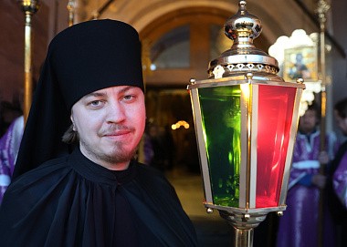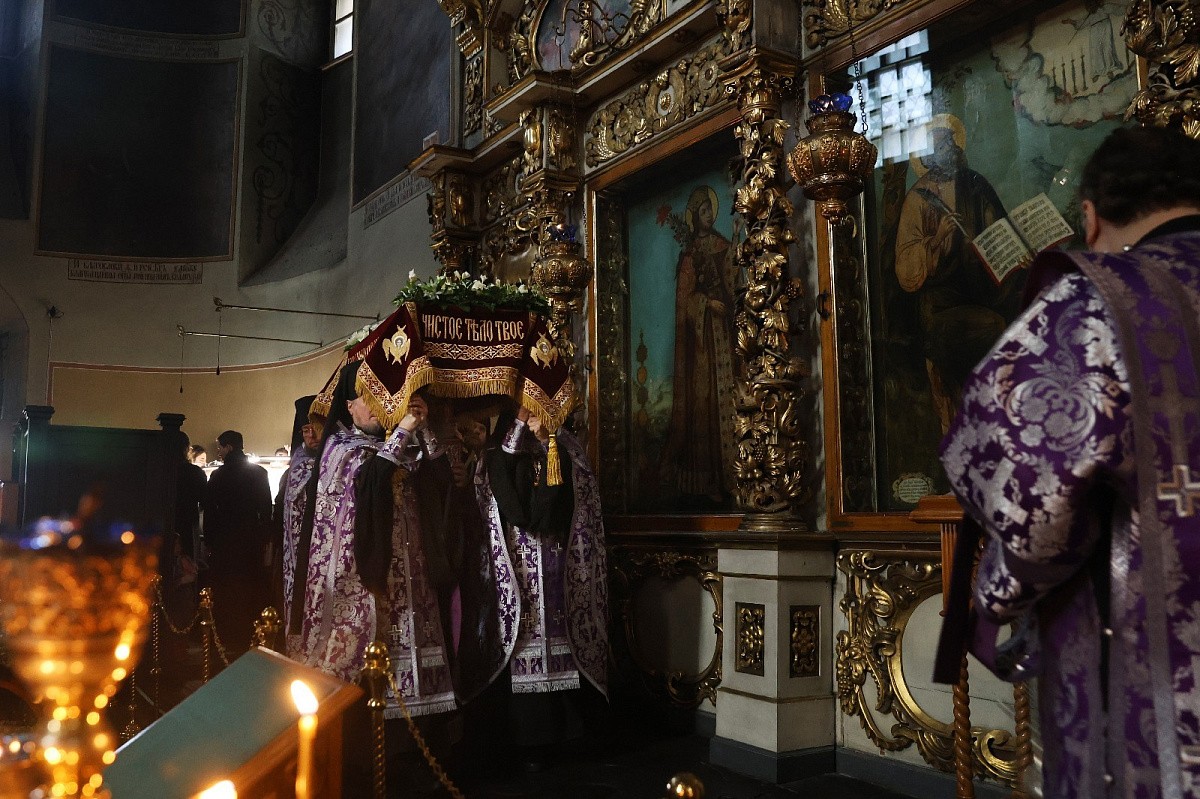 После великого славословия с пением погребального «Святый Боже» был совершен крестный ход вокруг собора с Плащаницей.