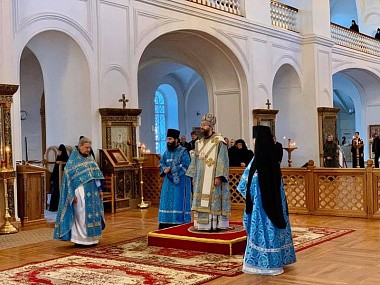 Игумения Сергия (Щербакова) поздравила Преосвященного епископа Леонида с праздником Покрова Матери Божией и поблагодарила за торжественную Литургию. В знак признательности и любви о Господе матушка преподнесла владыке святую просфору и картину с видом монастыря.