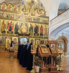 Праздничные богослужения прошли в Казанском соборе. По традиции на поклонение в центр храма была вынесена Казанская икона Божией Матери, написанная до революции, – список с утраченной чудотворной иконы. Перед образом на малой вечерне сестрами был пропет акафист Казанской иконе Богородицы.