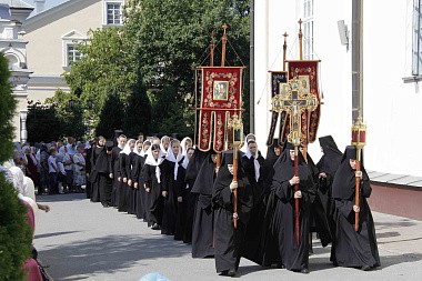 Всенощное бдение возглавил также митрополит Ириней. По сложившейся монастырской традиции литию вокруг храма совершил епископ Пимен. На утрени был отслужен чин Погребения Божией Матери. По великом славословии при пении погребального «Святый Боже…» крестным ходом Плащаницу обнесли вокруг храма.