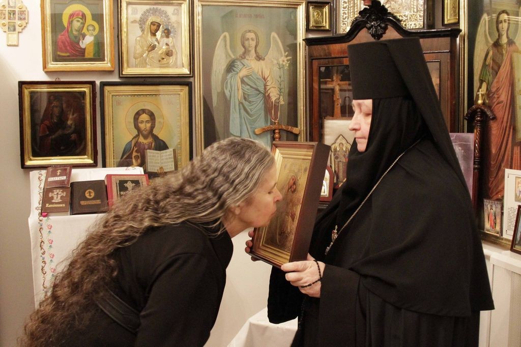 В завершение Высокопреосвященнейший владыка поздравил новопостриженных сестер, произнес для них назидательное слово и вручил памятные подарки – иконы святых мучениц Веры, Надежды, Любови и матери их Софии.