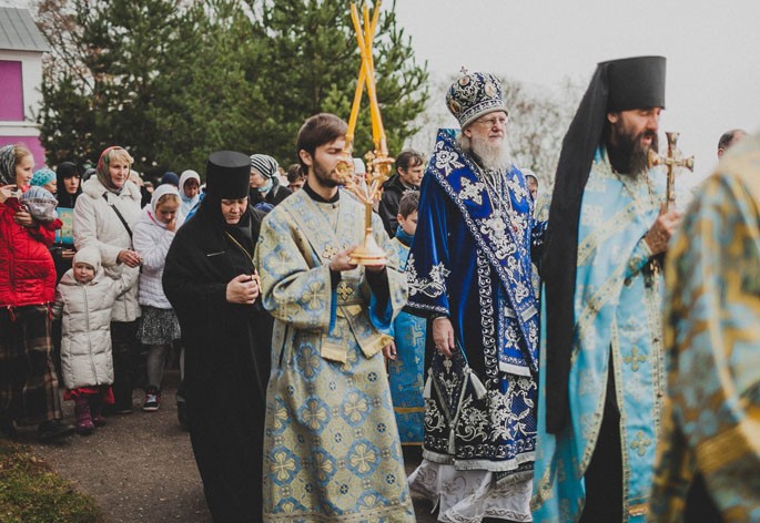 По окончании Литургии был совершен праздничный крестный ход в Иерусалимский храм, где находится чтимая икона Божией Матери «Иерусалимская». Епископ Серафим поклонился почитаемому образу, был отслужен молебен.