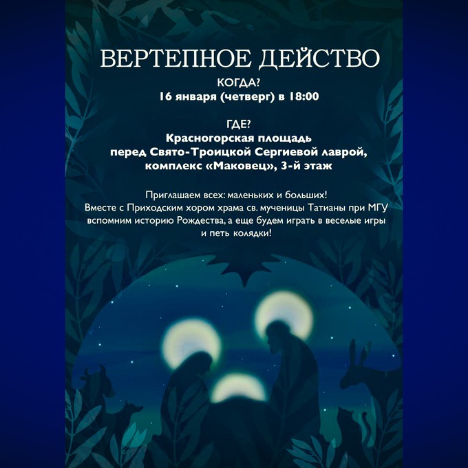 16 января 2025 года в культурно-просветительском центре Свято-Троицкой Сергиевой лавры «Киновия» состоится святочное представление «Рождественский вертеп» ансамбля Татианинского храма МГУ. Для детей будут организованы веселые игры и колядки.