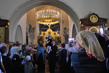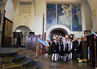 По окончании Литургии протоиерей Артемий Владимиров вместе со школьниками обратился ко Всецарице и Ее Благому Сыну с краткой молитвой, испрашивая благословения на учебный год и помощь на благие дела, и окропил прихожан святой водой.