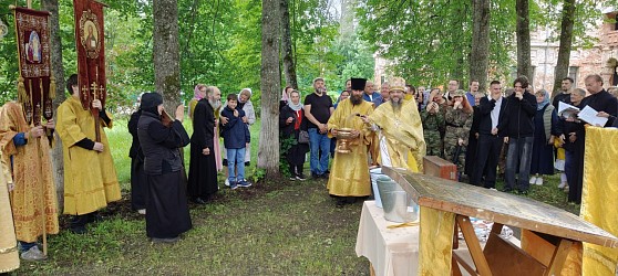 Затем в Успенском соборе монастыря была совершена поздняя Литургия, которую возглавил наместник обители архимандрит Сергий (Воронков). По окончании Литургии братия и многочисленные паломники направились в скит, где был отслужен водосвятный молебен. Все помещения скита, где идут восстановительные работы, окропили освященной водой.